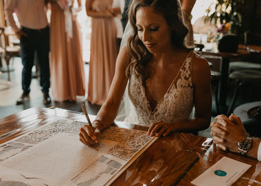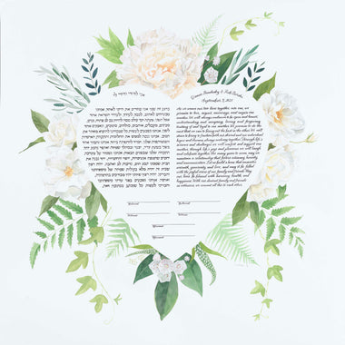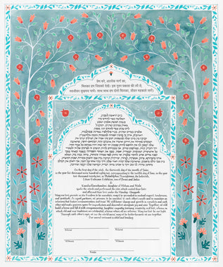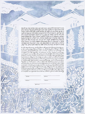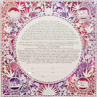 Custom commissioned hand-painted and papercut ketubahs begin at $2500. Your text can be hand-lettered using a traditional dip pen and ink, or archivally printed. Your custom illustration will be hand-painted using the highest quality designer gouache paint directly on beautiful Arches 100% cotton rag paper, and 14k gold leafing embellishments can be included as well. Custom papercut ketubahs are meticulously cut by hand. Please allow a minimum of 4 months for Custom Ketubah or Wedding Certificate commissions. To read more about timeline, pricing, and deliverables take a look at this blog post.